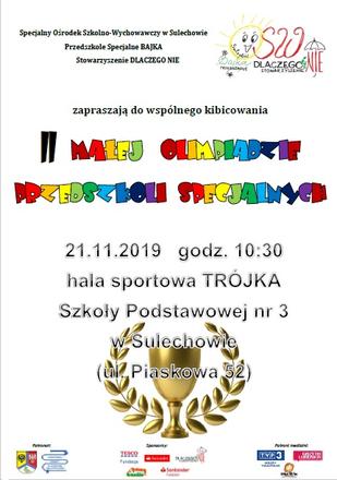 Specjalny Ośrodek Szkolno - Wychowawczy zaprasza na II Małą Olimpiadę Przedszkoli Specjalnych , która odbędzie się 21 listopada br. o godz. 10:30 w hali sportowej TRÓJKA w Szkole Podstawowej nr 3 w Sulechowie.