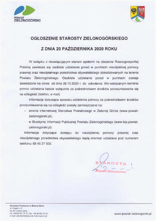 Ogłoszenie Starosty Zielonogórskiego z 20.10.2020 r.
