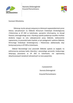 OGŁOSZENIE STAROSTY ZIELONOGÓRSKIEGO