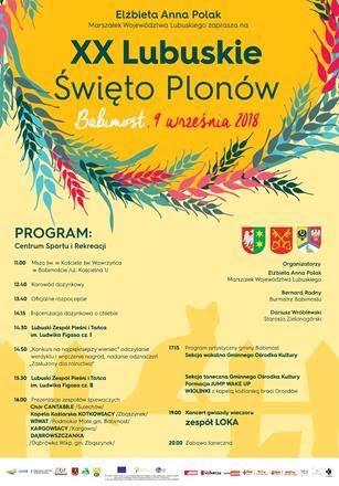 W niedzielę, 9 września odbędzie się Lubuskie Święto Plonów. Tegoroczna impreza zostanie zorganizowana w Babimoście. Dożynki rozpoczną się mszą świętą w kościele św. Wawrzyńca, następnie korowód przejdzie na plac przy Centrum Sportu i Rekreacji. Tam będzie czekać na przybyłych część obrzędowa, jak również artystyczna i świetna zabawa. Jako współorganizatorzy serdecznie zapraszamy. Więcej szczegółów na dołączonym plakacie.