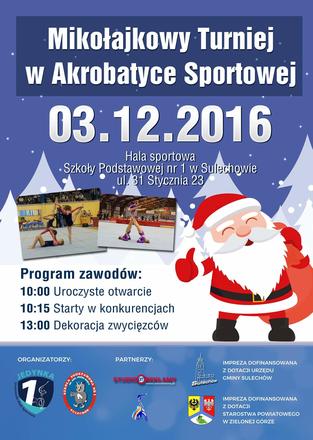 Uczniowski Klub Sportowy "Jedynka" oraz Szkoła Podstawowa Nr 1 w Sulechowie zapraszają na Mikołajkowy Turniej w Akrobatyce Sportowej, który odbędzie się 3 grudnia br. w godz. od 10:00 do 13:00.